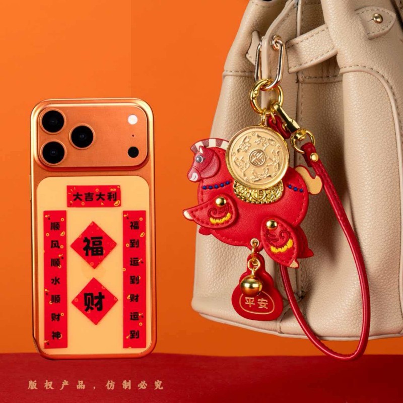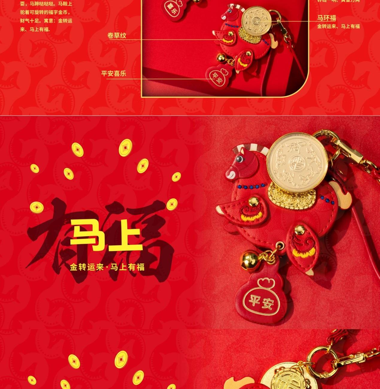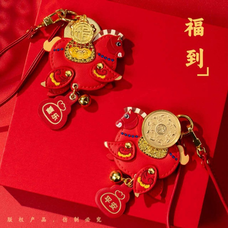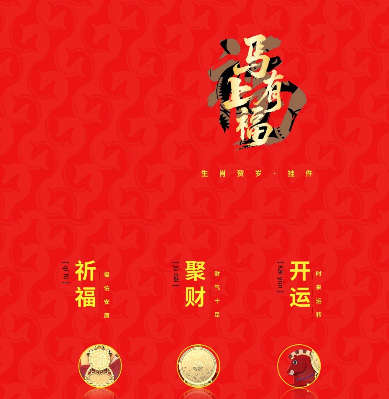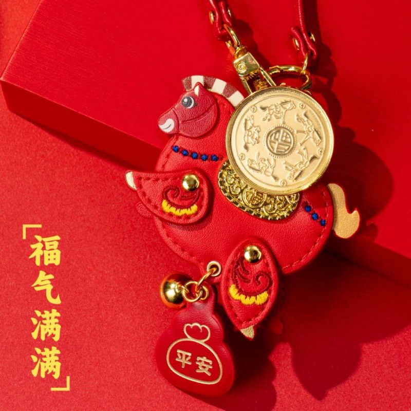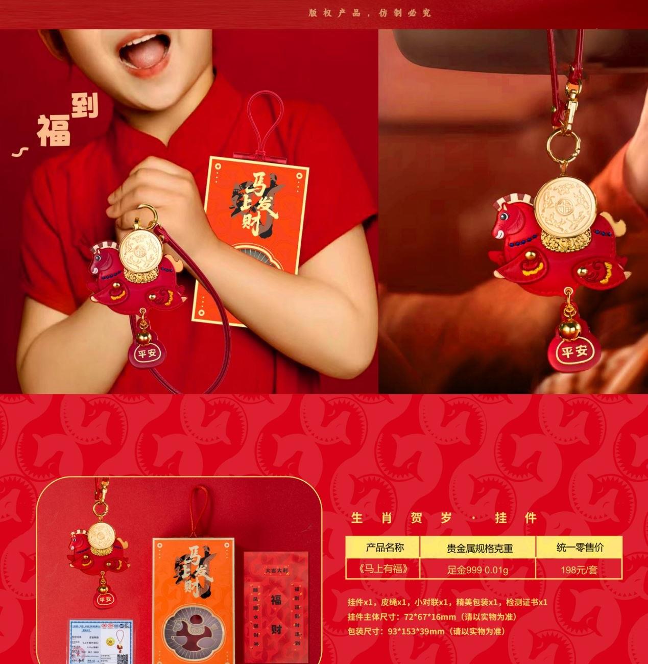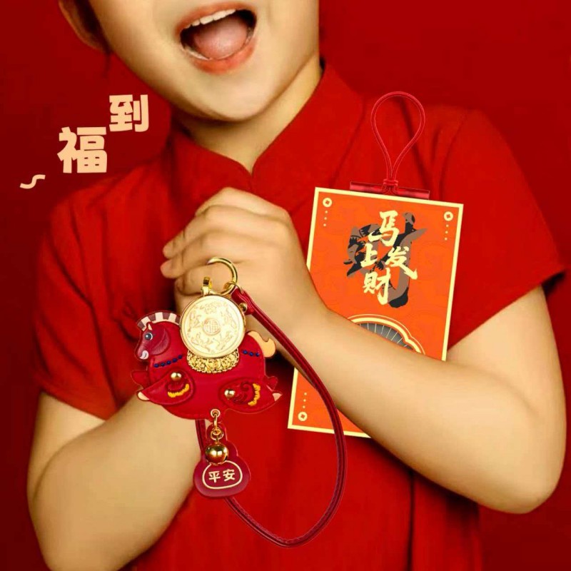 产品配置: 1.挂件x1个 2.质检证书x1张 3.精美包装x1个 4.贵金属规格:足金999 0.01g 设计以“马上有福”为贺岁主题。设计以新一代审美与解读,以唐马造型为灵感来源,打造一版Q萌可爱的马挂件。四腿腾空可随意摆动,乘风破浪。如意福马鞍上驼着可旋转的福字金币寓意:万福金鞍,马上有福