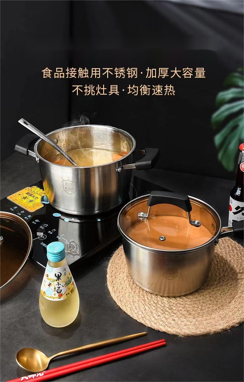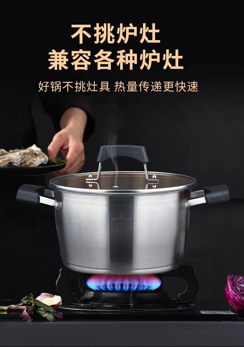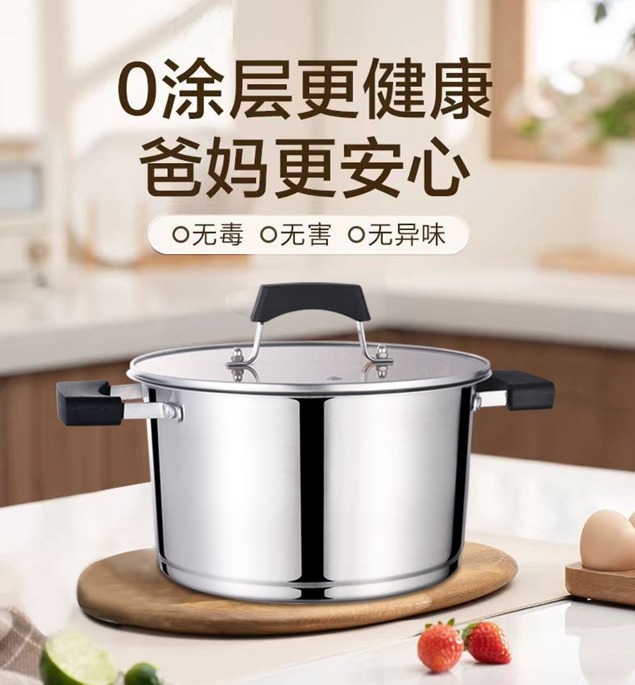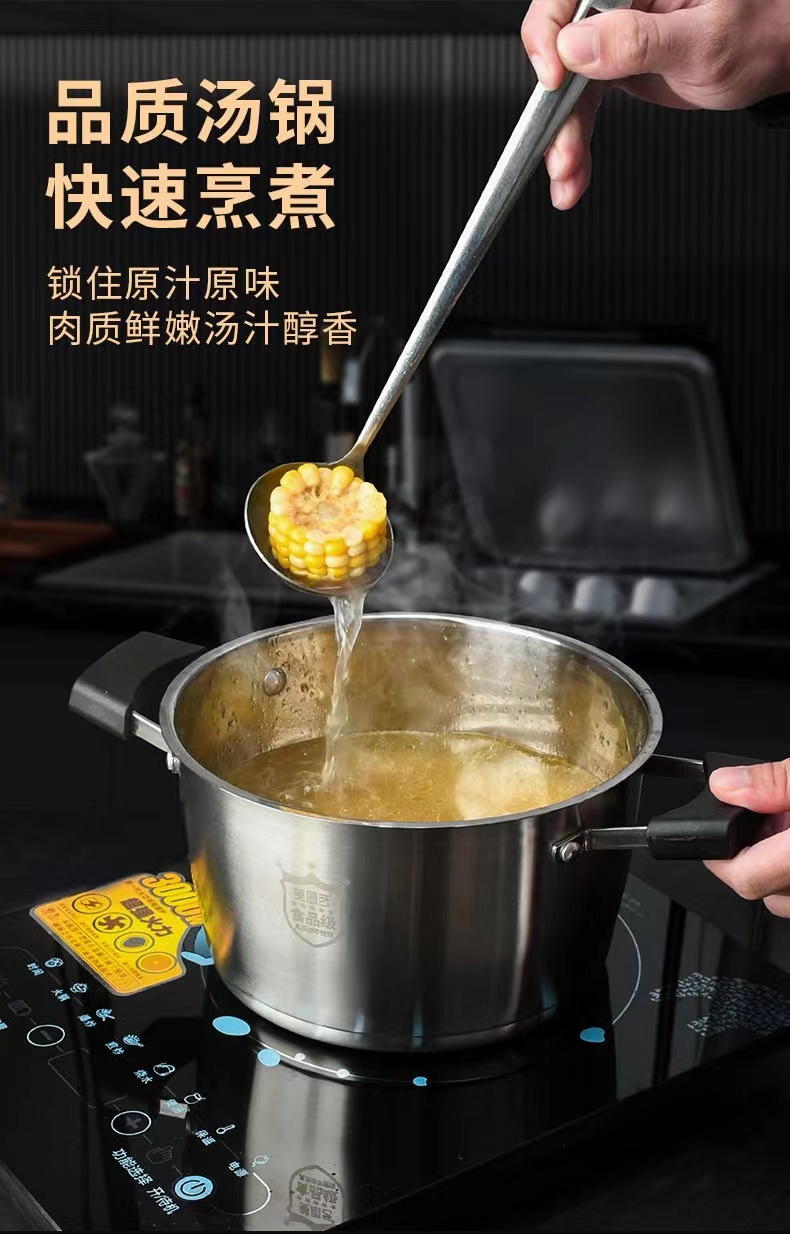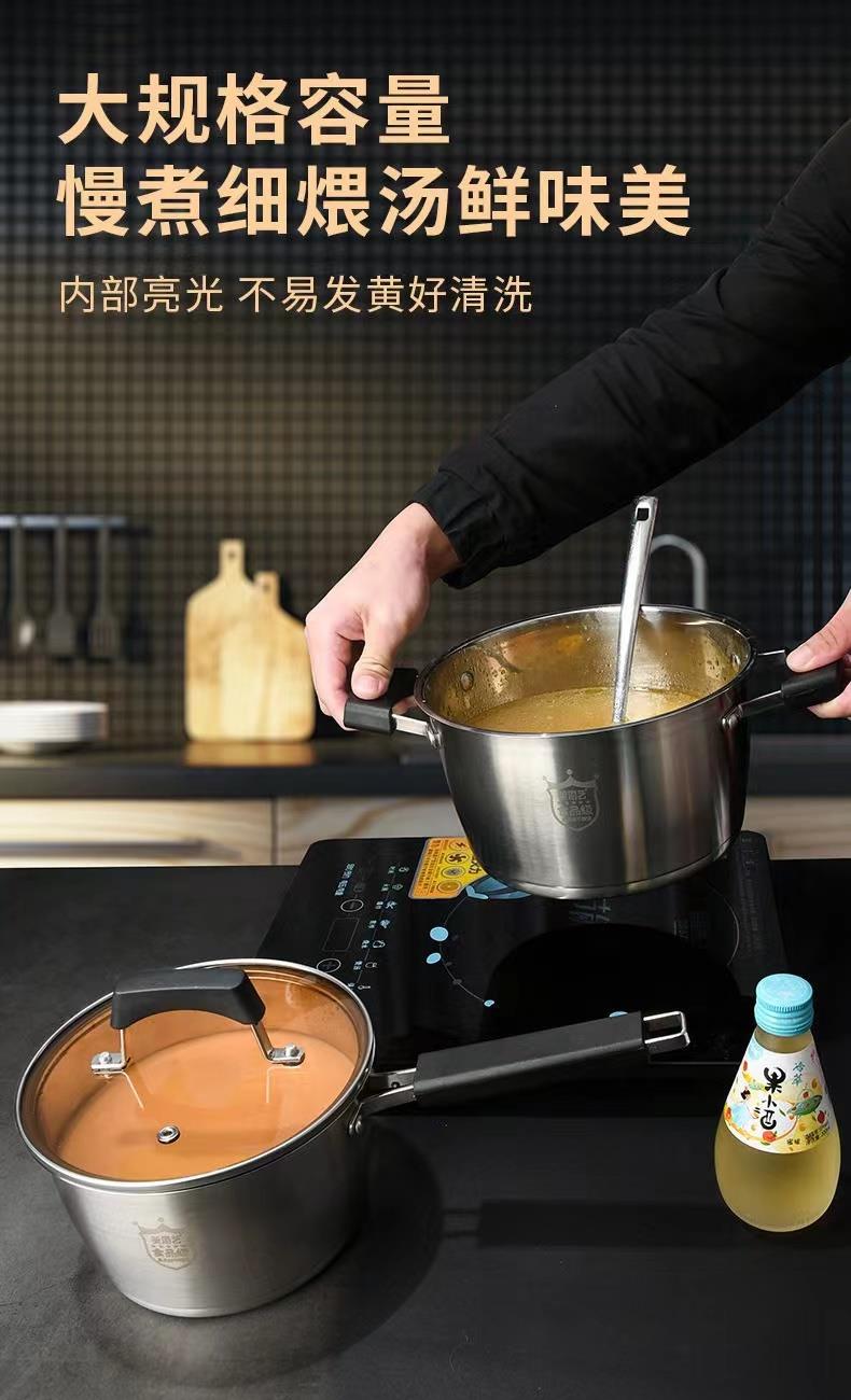尺寸:22cm 材质:奥氏体不锈钢(201) 包装尺寸:31.4*15.4*25.4cm 包装重量:1.55kg 优质不锈钢锅体,精细砂光,美观耐用 T型锅底,迅速加热 新型电木防烫手柄,握感舒适,更易取放 汤锅满足家庭简单所需
