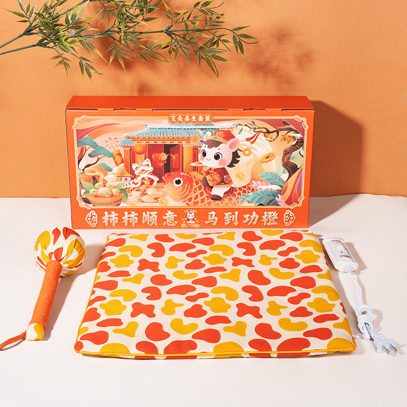 礼盒规格:460*240*100mm 产品配置:电加热艾绒坐垫40*40cm*1(含布套、加热芯、艾绒垫、开关) 艾草养生锤26cm*1 推荐理由: 1、主题“柿柿顺意 马到功橙”,吉祥寓意满满,既与产品面料颜色图案相呼应,又体现了马年开门红元素,是新年贺岁、开门红主题产品! 2、橙色系瓦楞礼盒,国潮图案,喜庆大气。 3、精选老粗布面料,亲肤耐磨,色彩艳丽,祥云片片/好柿连连双色可选,美得各有千秋。 4、艾草锤,填充多味本草,艾在手上,锤出安康;电加热艾绒坐垫,无火无烟艾灸,温暖呵护,排湿除寒,疏经通络,改善亚健康;搭配使用,健康翻倍。
